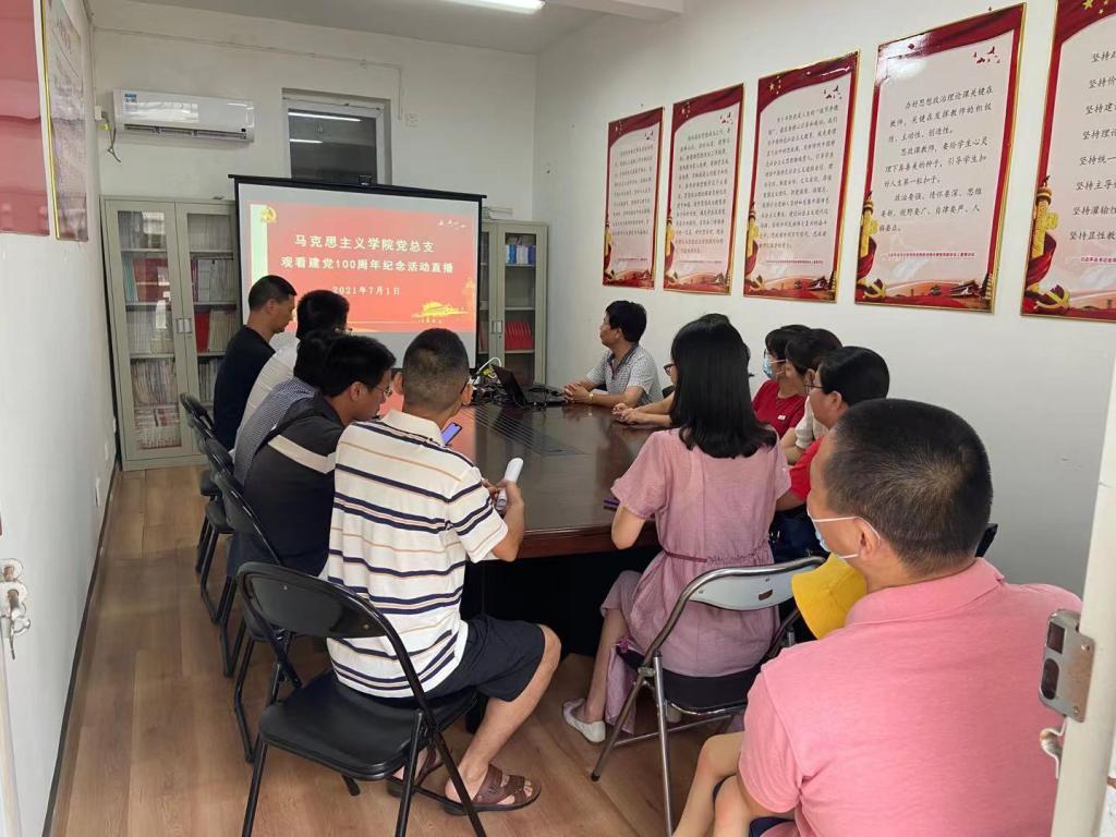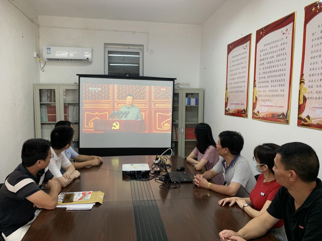7月1日上午,马克思主义学院党总支组织全体党员在会议室集体收看庆祝中国共产党成立100周年大会实况直播,认真学习习近平总书记在庆祝大会上的重要讲话。庆祝大会结束后,“求实”、“求是”两个党支部分别进行学习感悟交流,讨论宣传贯彻方案。同志们纷纷表示,总书记讲话高屋建瓴、思想深邃,进一步宣示了党对马克思主义的坚定信仰和以人民为中心的执政宗旨,阐明了党为实现中华民族伟大复兴顽强奋斗取得的辉煌与荣光,凝练了党在百年征程中形成的“坚持真理、坚守理想,践行初心、担当使命,不怕牺牲、英勇斗争,对党忠诚、不负人民”的伟大建党精神,提出了“以史为鉴,开创未来”必须遵循的一系列原则要求,铿锵豪迈、催人奋进。大家收看后内心无比骄傲与自豪,增强了对党忠诚的底气和决心。作为高校思想政治理论课教师,我们要继续弘扬光荣传统,赓续红色血脉,积极开拓,守正创新,立足三尺讲堂,做好立德树人本职,永远把伟大建党精神传承下去、发扬光大!为全面建设社会主义现代化国家,全方位推动福建高质量发展超越,高水平推进特色鲜明的技术师范院校建设而不懈奋斗!