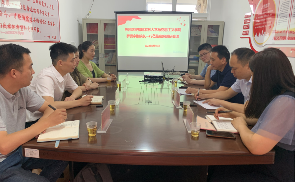 6月15日上午,福建农林大学马克思主义学院副院长罗贤宇,形势与政策教研部主任朱逸涵、副主任黄登良、教师王欢等一行来访我院。我院院长林书红教授、副院长陈赵阳教授、陈飞教授,习近平新时代中国特色社会主义思想概论教研室主任庄梅兰副教授出席此次座谈会。