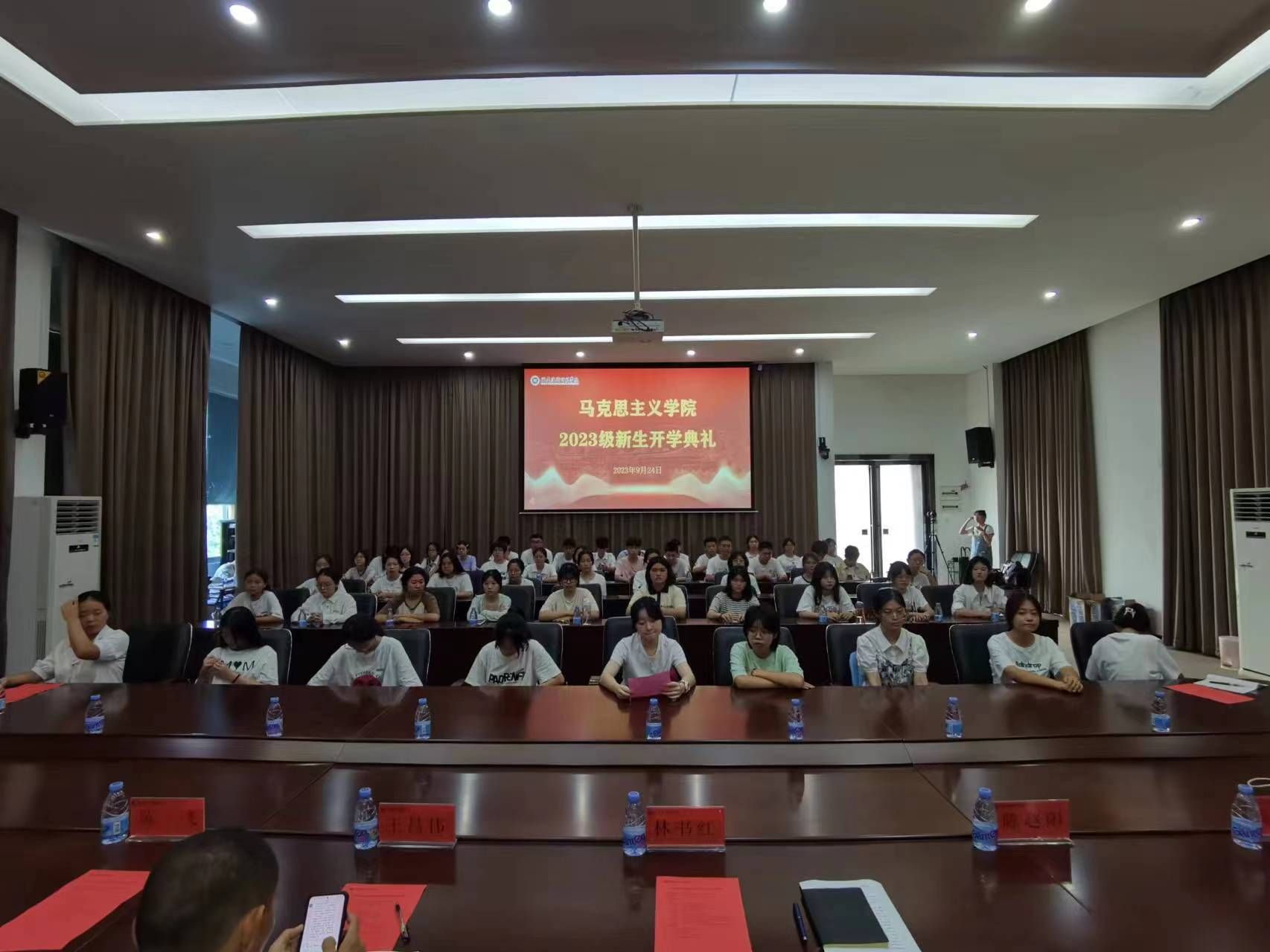 9月24日上午,我院在图书馆报告厅隆重举行2023级新生开学典礼。院长林书红,党总支副书记(主持工作)王昌伟,副书记、副院长陈赵阳,副院长陈飞,办公室主任黄建和,各教研室主任,教师代表王小琴,新生班主任郑俊婷及2023级思想政治教育(师范)专业全体新生参加了开学典礼。典礼由新生辅导员吴琪主持。