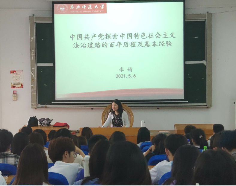 2021年5月6日下午,东北师范大学马克思主义学院教授、博士生导师李婧应邀走进我校求真大讲堂,在教学楼201室为2019级旅游管理、2019级包装工程、2020级旅游管理与教育服务等专业学生作题为《中国共产党探索中国特色社会主义法治道路的百年历程及基本经验》的“形势与政策”专题辅导报告。报告会由马克思主义学院副院长陈赵阳副教授主持,“形势与政策”课教研室教师聆听了报告。