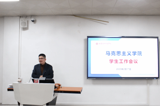 2025年2月17日晚,我院于科学楼K110召开新学期学生工作会议暨学生安全教育第一课。学院党总支副书记(主持工作)陈飞、团委副书记、辅导员姜平、陈子詹老师与全体学生参加本次会议。