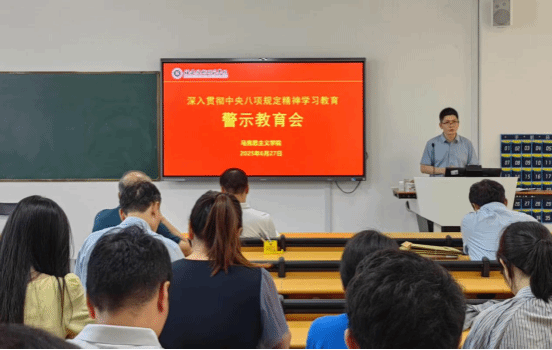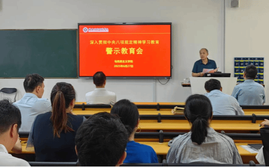 6月27日上午,马克思主义学院党总支在科学楼109召开深入贯彻中央八项规定精神学习教育警示教育会,学院党政班子成员、全体教师党员参加会议。本次会议由党总支副书记(主持工作)陈飞主持。